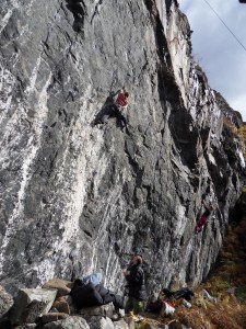 I will never forget the thrill of coming round the rise from Goat Crag and seeing it for the first time on a wet, exploration day seventeen years ago. I had found what I was looking for….the ultimate crag. It is still as much fun to be there as it always was when I thought I might get up some of the routes. The effort of trying must surely be good for my climbing?? There are fifteen routes there now, some great link-ups and a project. Room for more? Ian Taylor thinks so. One day he will girdle the crag along the Quartz Vein and that will be it, no more bolting required.
